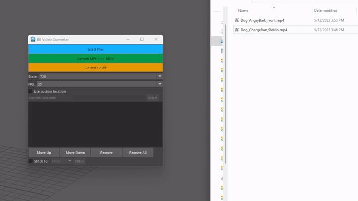 Converts MP4 to MOV and vice versa, as well as GIF using FFmpeg